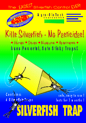 The Silverfish Trap captures adult and nymphal stages of silverfish, bristletails, firebrats and other insects. The trap works by intercepting running insects searching for food in your home. Silverfish and related insects occur almost every where, and are attracted by human foods, especially starchy foods, glue and old papers. The insects travel along edges, and can be caught beside baseboards, the corners of cupboards and along the back edges of shelving. Adult silverfish can live for years and lay only a few eggs at a time. Frequent cleaning and vacuuming, and disposal of old papers will assist in reducing silverfish problems. Long term use of Silverfish traps will reduce troubling infestations without the use of toxic chemicals. Silverfish are annoying and can damage paper items, such as photographs, mementos and valuable papers. They breed in cool damp areas, such as attics, under shakes and shingles, and in walls. They are found almost everywhere.